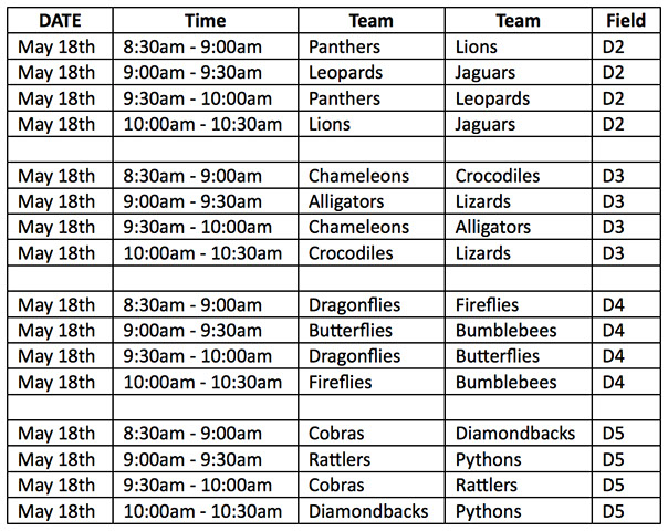 The end of the season is upon us. The game schedule for Saturday May 18th is shown below. NOTE THAT THERE ARE TWO 30-MINUTE GAMES TO BE PLAYED. These two games are short but it makes things fast and fun!