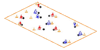 Define a rectangular space. Each player starts with a ball and a cone. Each player must control their own cone while trying to attack and kick over other cones. Player must keep the ball under control while defending and attacking. When defending, try to block attackers by keeping your ball and body between the cone and the attacker. On attack, try to maneuver around defenders while controlling your ball to get a clear kick at their cone. If your cone is kicked over, you can set it up again after you do an exercise (situps, pushups, etc.), dribbling move or juggling of the soccer ball.